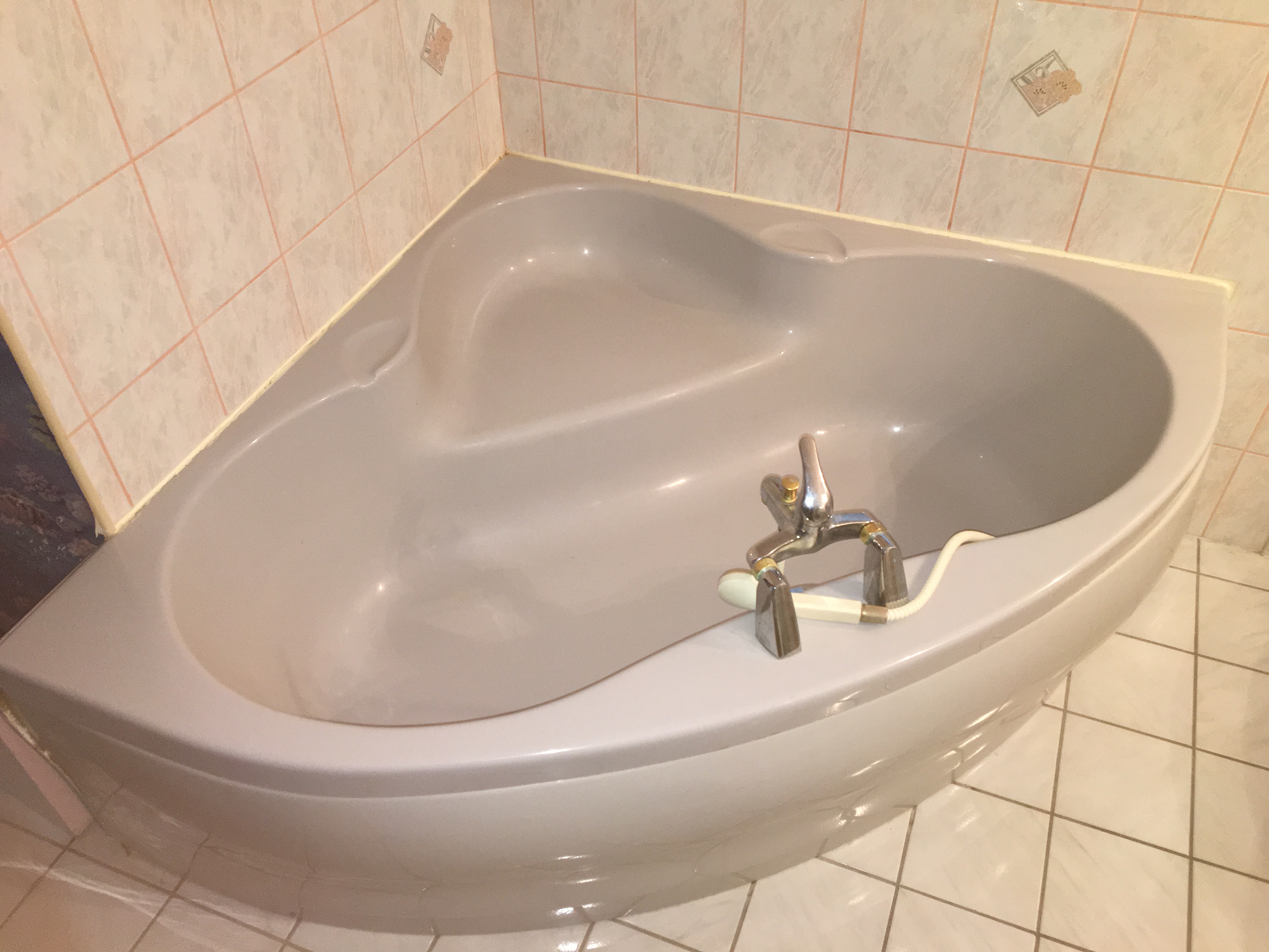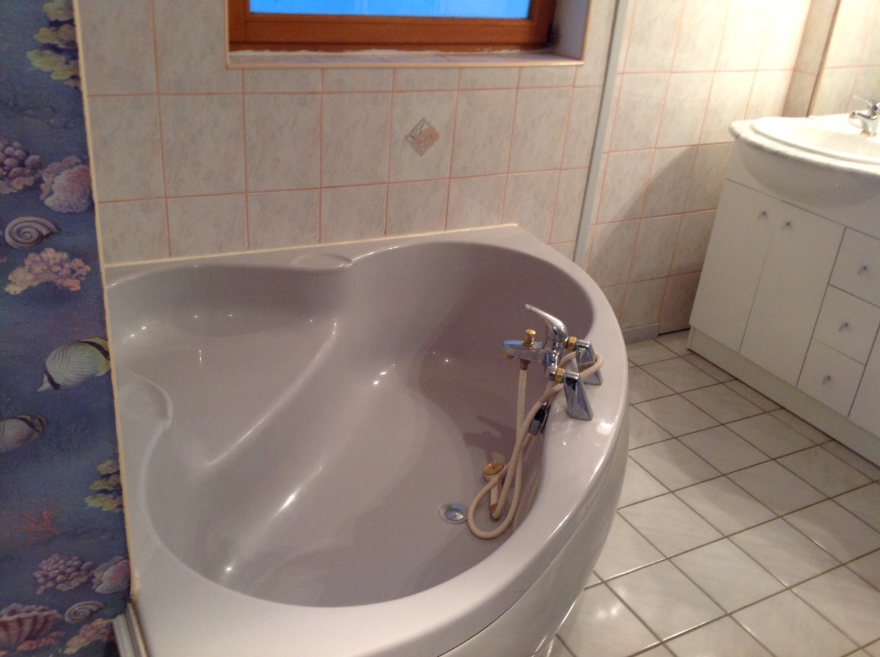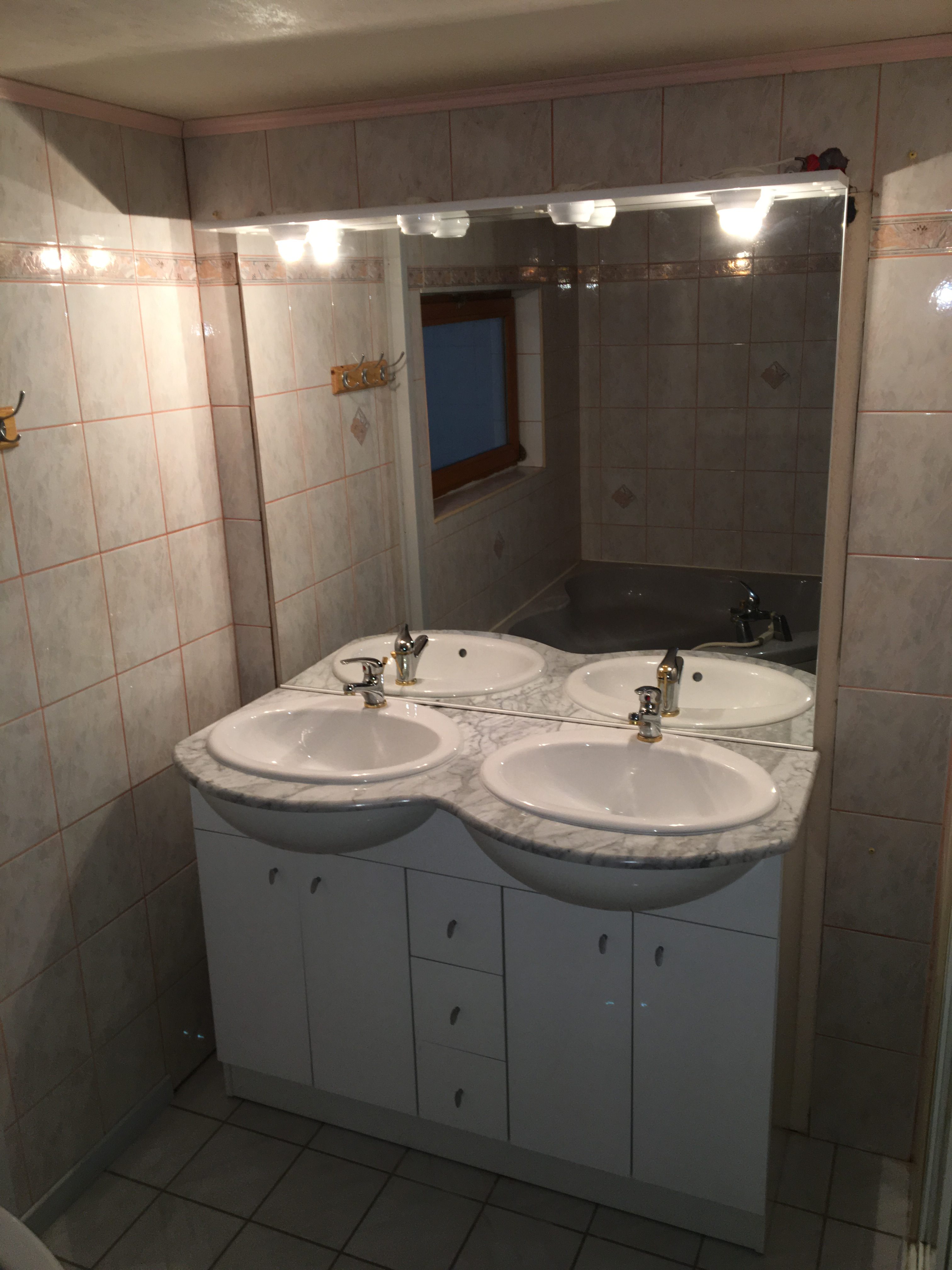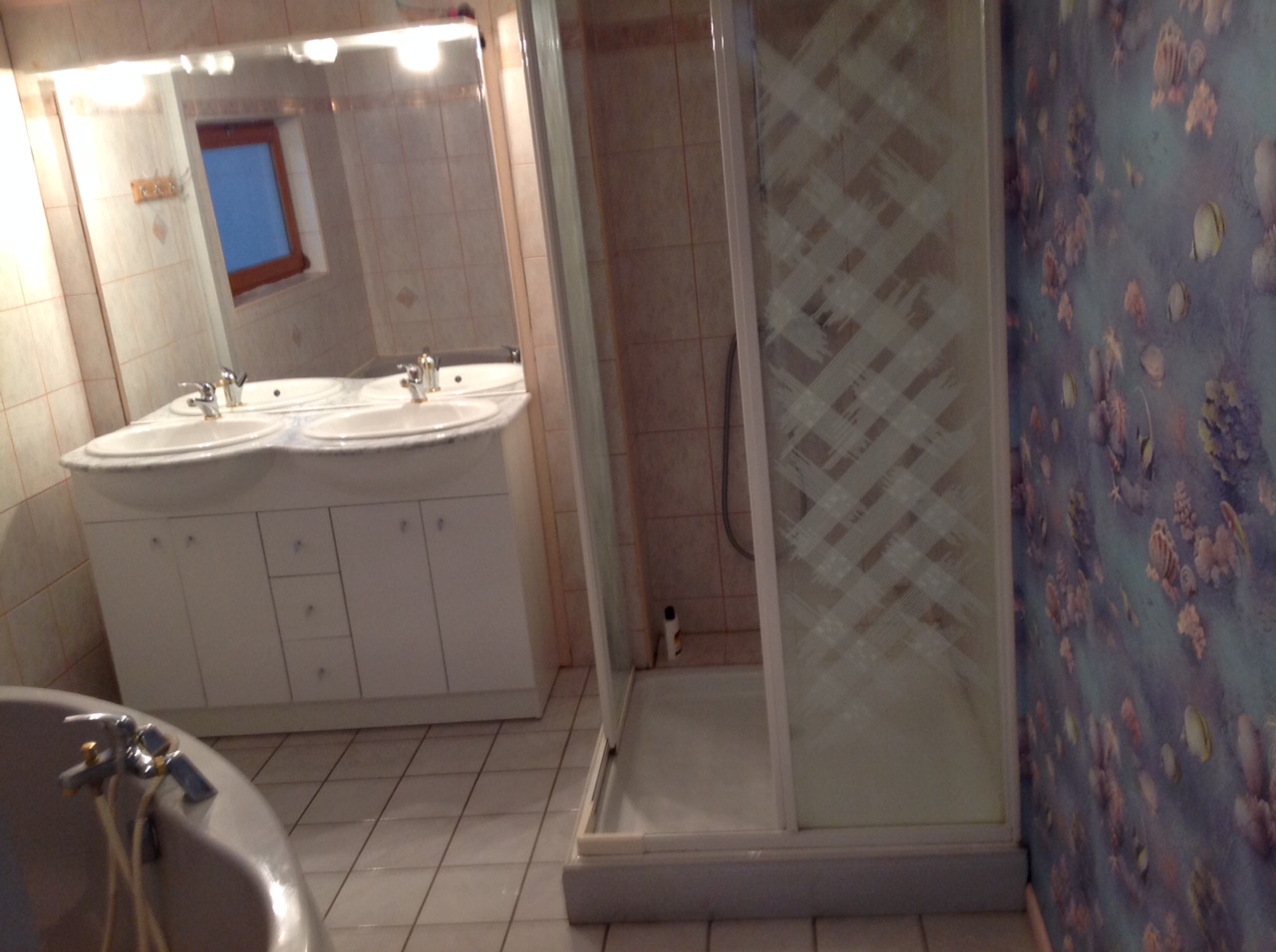 Salle de bain comprenant une baignoire d’angle , une cabine de douche et deux vasques , WC à part.