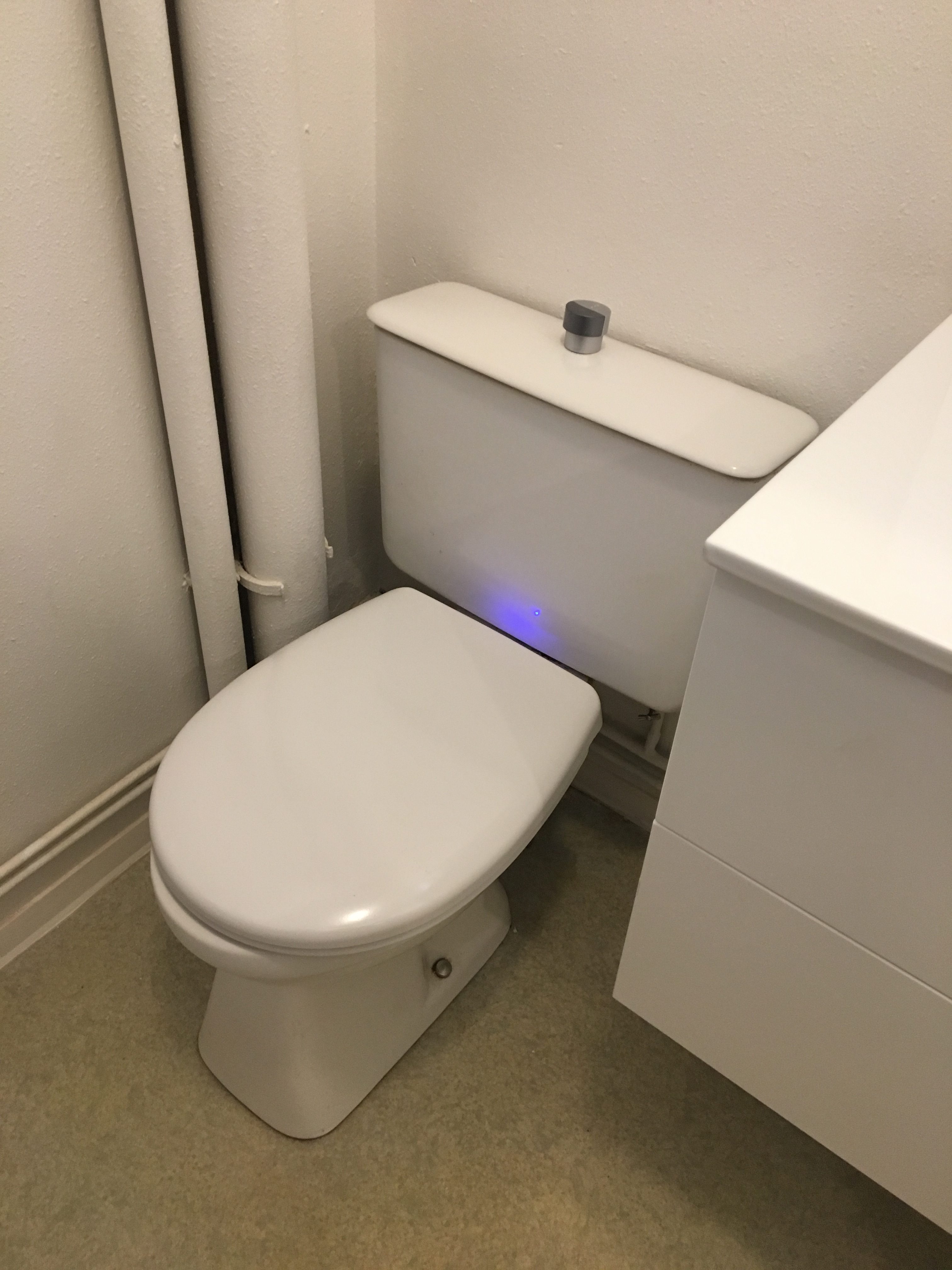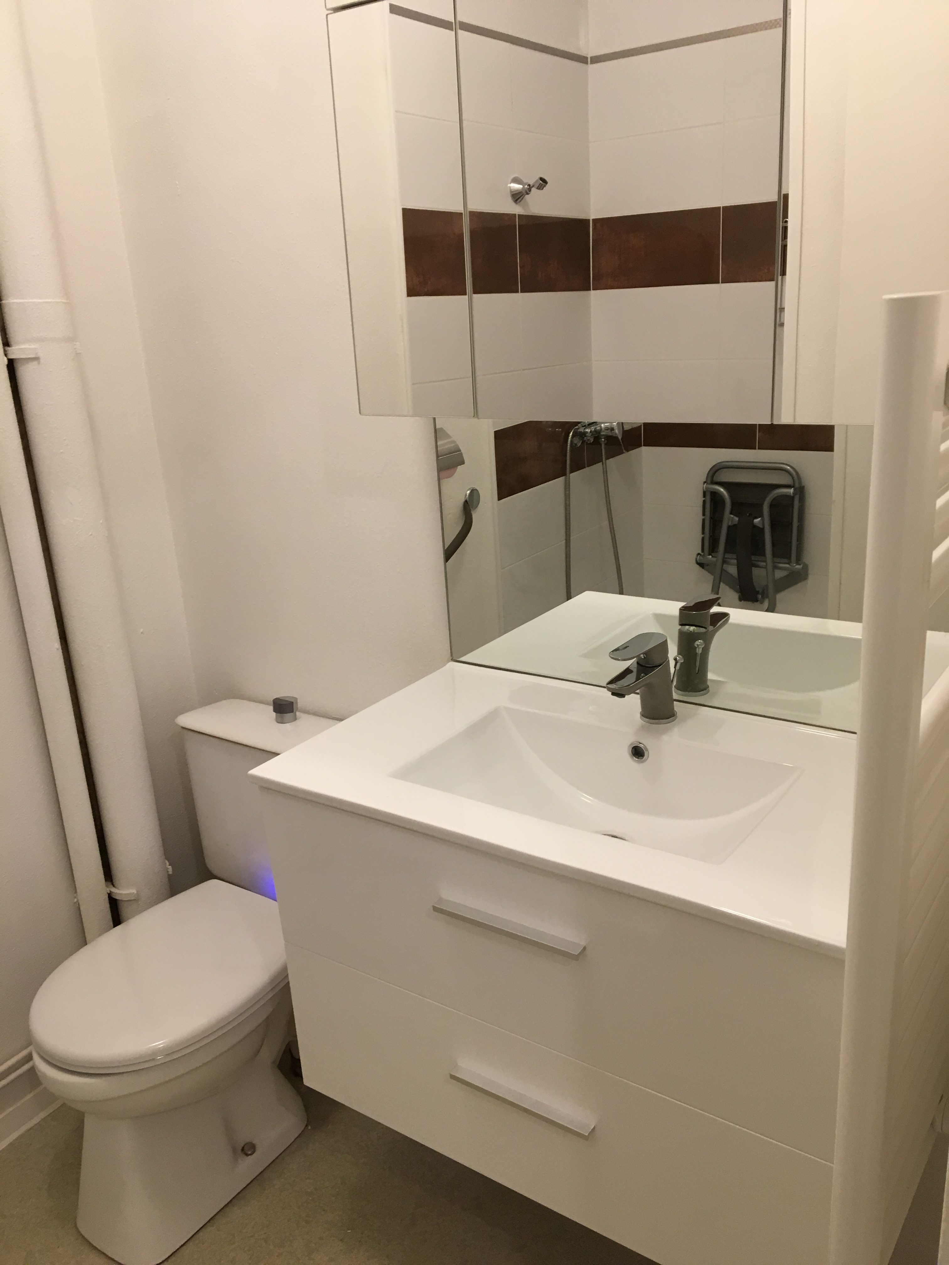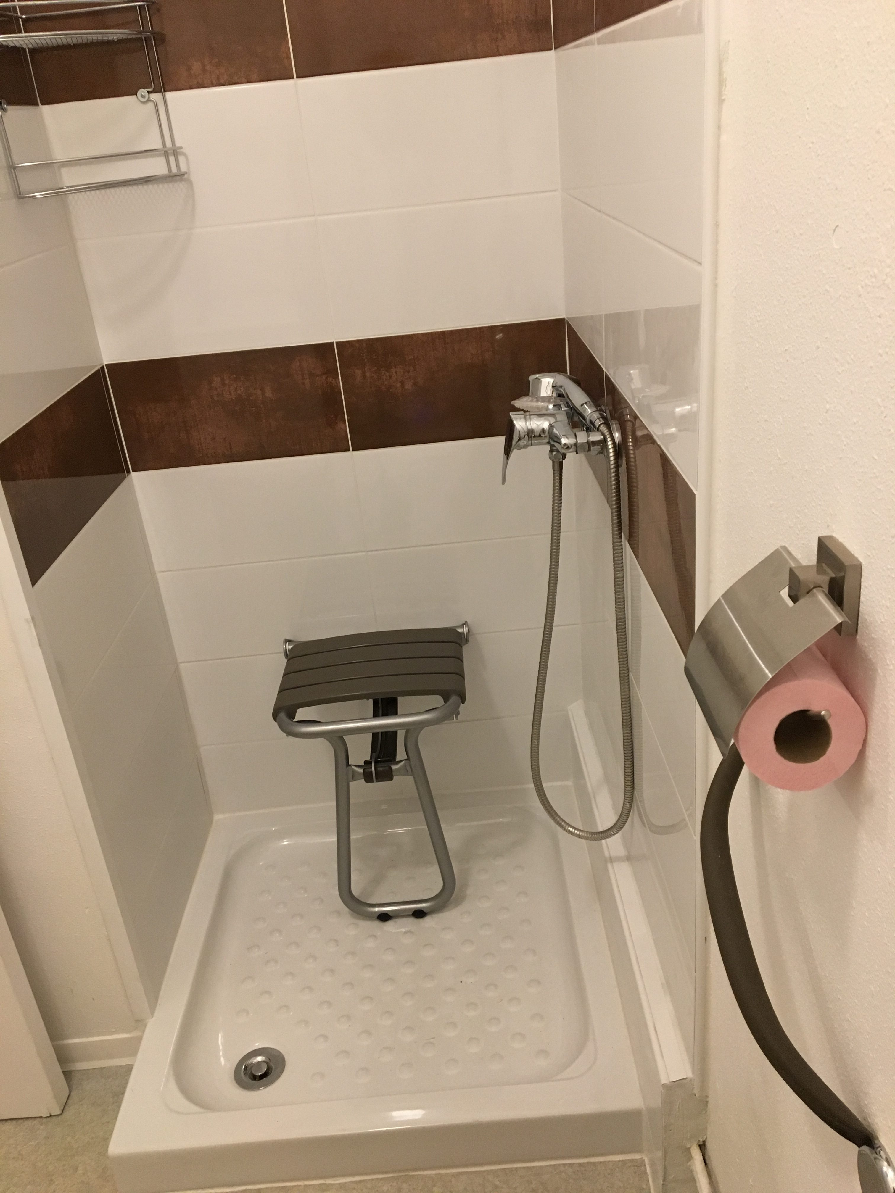 Une salle de bain comprenant douche avec siège, Douchette avec système détection visuel de chaleur de l’eau , vasque lavabo, 2 tiroirs et WC avec éclairage de nuit.